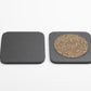 This set of coasters is made of black Valchromat, colored engineered wood, with a matte finish. It features a quality cork rubber bottom that prevents scuffing tabletops and slipping.